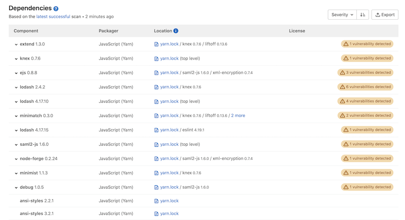 | Location | For system dependencies, this lists the image that was scanned. For application dependencies, this shows a link to the packager-specific lock file in your project that declared the dependency. It also shows the dependency path to a top-level dependency, if any, and if supported. |